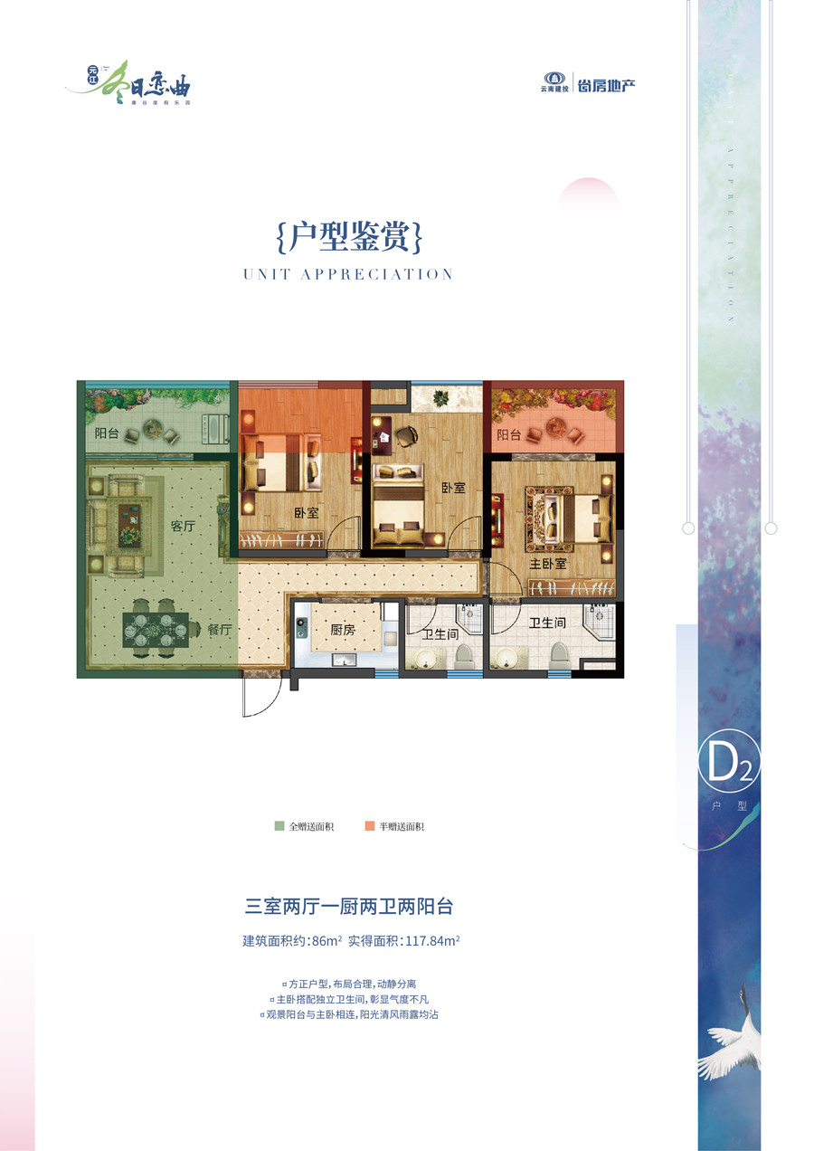 D2戶型86㎡ 3房2廳1廚2衛(wèi)+3陽臺(tái)=117.84㎡